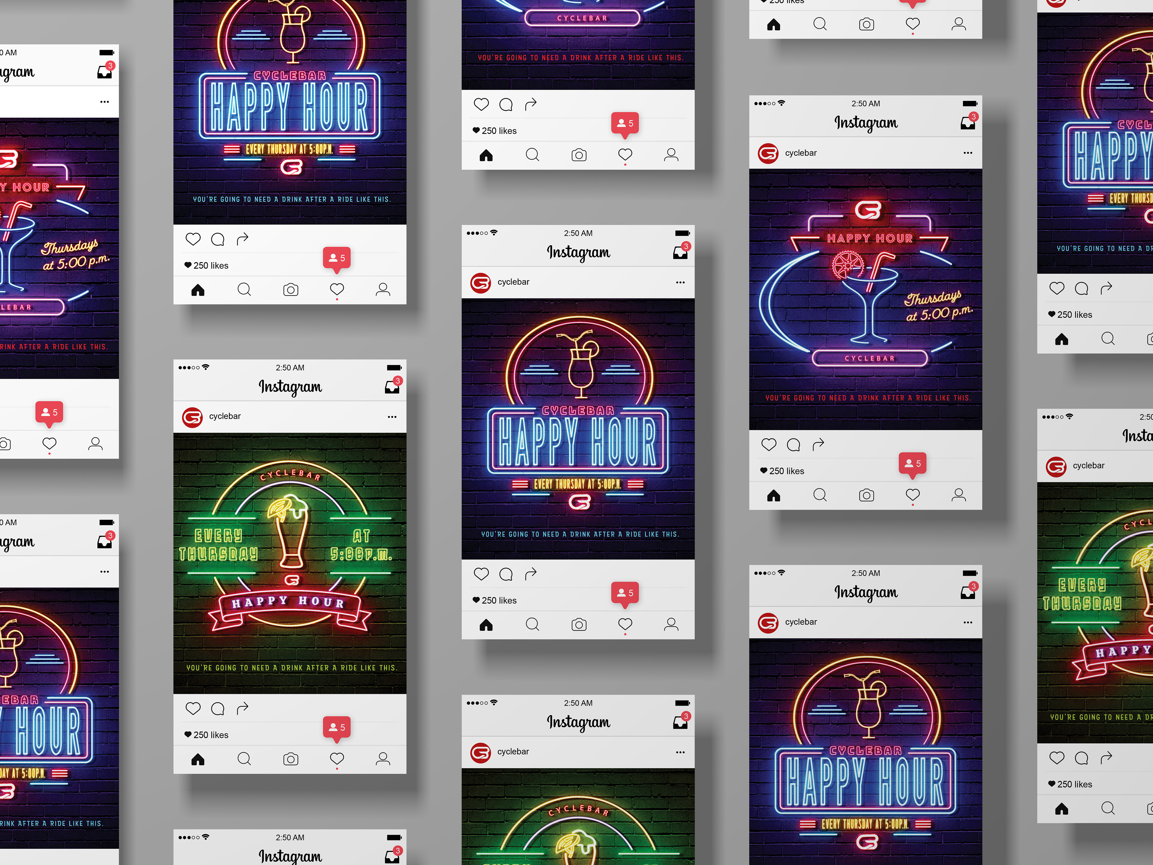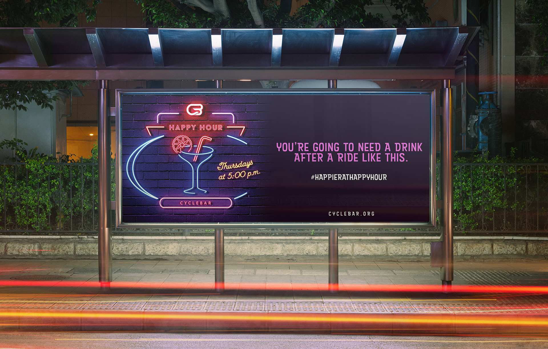 Cyclebar is an indoor cycling studio with a "rock concert-like" atmosphere. In this ad campaign, I chose to focus on their “Happy Hour” class that is offered every Thursday at 5:00p.m. It is a 45 minute cycling class followed by a variety of spirits available after the ride. During Cyclebar sessions, the music is bumping and a lot of us are focused on our personal cyclestats that are displayed on the leaderboard throughout the class. This post-workout happy hour gives the cyclists a change to mingle with others as they rehydrate after their rides!